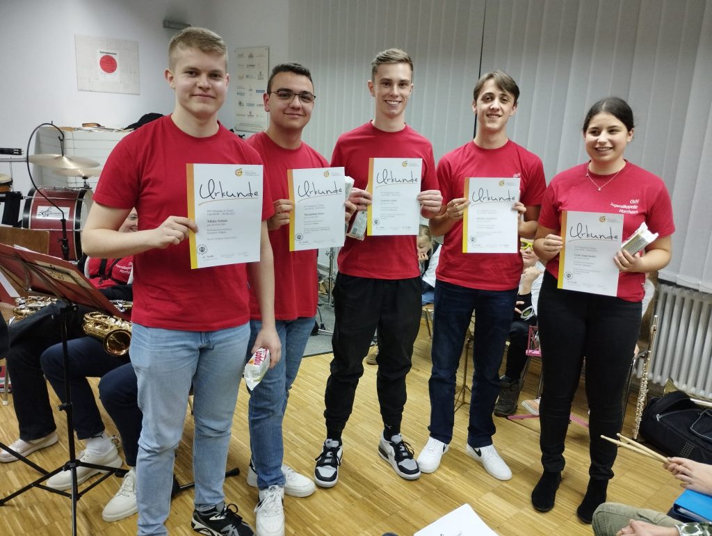 Die vom Kreisverband angebotenen Fortbildungen werden von den Musikern immer gerne besucht. Fünf Musiker konnten für eine erfolgreiche Lehrgangsteilnahme ausgezeichnet werden. Den D1 Lehrgang absolvierten Laurens Adam, Hannes Aisenbrey und Maximilian Giese. Den D2 Lehrgang bestand Lena Angermaier und Niklas Scholz mit sehr guter Leistung. Die Musiker wurden ebenfalls mit Urkunden und einer kleinen Süssigkeit vom Verein belohnt.