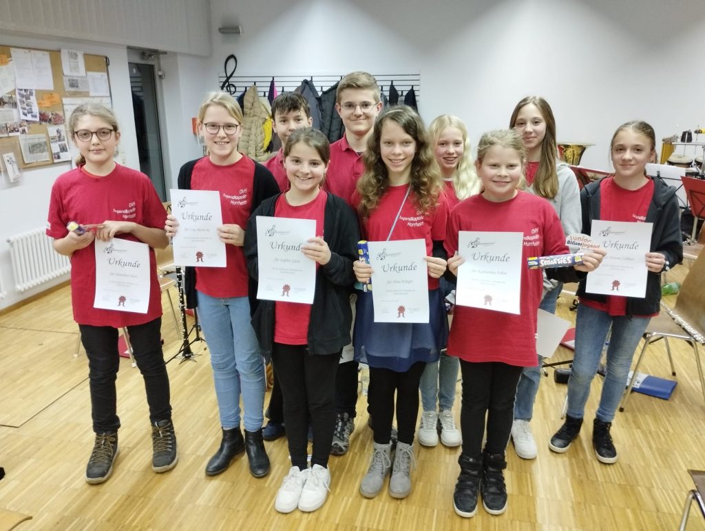 Anschließend stieg bei zehn Musikern ganz schön die Spannung. Lena Angermaier und Jannika Aisenbrey führten in den letzten Wochen das Juniorabzeichen durch. Sie übten mit den Zehn die Musiktheorie und nahmen auch einen kleinen Abschlusstest vor. Im praktischen Teil wurde dann von jedem Musiker am Jugendvorspiel ein Musikstück vor getragen. Hanna Collmer, Julia Flunckert, Katharina Fehse, Sophia Giese, Jonathan Kees, Nina Krieger, Lina Reinicke, Florian Scholz, Konstantin Weber und Naemi Weiberle legten alle erfolgreich das Juniorabzeichen ab und bekamen Urkunden und eine kleine Süssigkeit von Lena Angermaier überreicht.