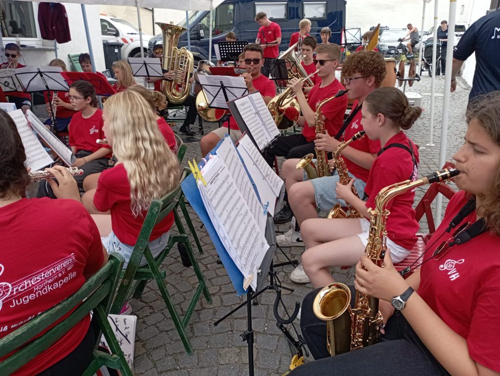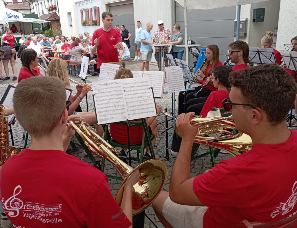 Nach der Spendenübergabe zeigten die jungen Musiker der Bläserklasse Horrheim/Ensingen ihr musikalisches Können mit verschiedenen Stücken. Hierauf folgte die Jugendkapelle des Orchestervereins unter der Leitung von Fabian Kobza mit einer Mischung von einigen traditionellen und vielen modernen Stücken. Nach den Jungmusikern durften die Musiker des Musikvereins Ensingen begrüßt werden. Mit einer guten und bunten Auswahl an Musikstücken wie „Auf der Vogelwiese“, „In the Mood“ und „Böhmischer Traum“ wurden die Gäste durch den Nachmittag begleitet. Am Abend schließlich betrat die Band Didi & Friends aus Horrheim die Bühne, zum inzwischen dritten Mal auf dem Kelterfest. Bei einer Vielzahl an bekannten Liedern und Songs hielt es viele nicht auf den Bänken. Nach drei Runden endete der erste Tag des Kelterfests weit nach elf Uhr abends.