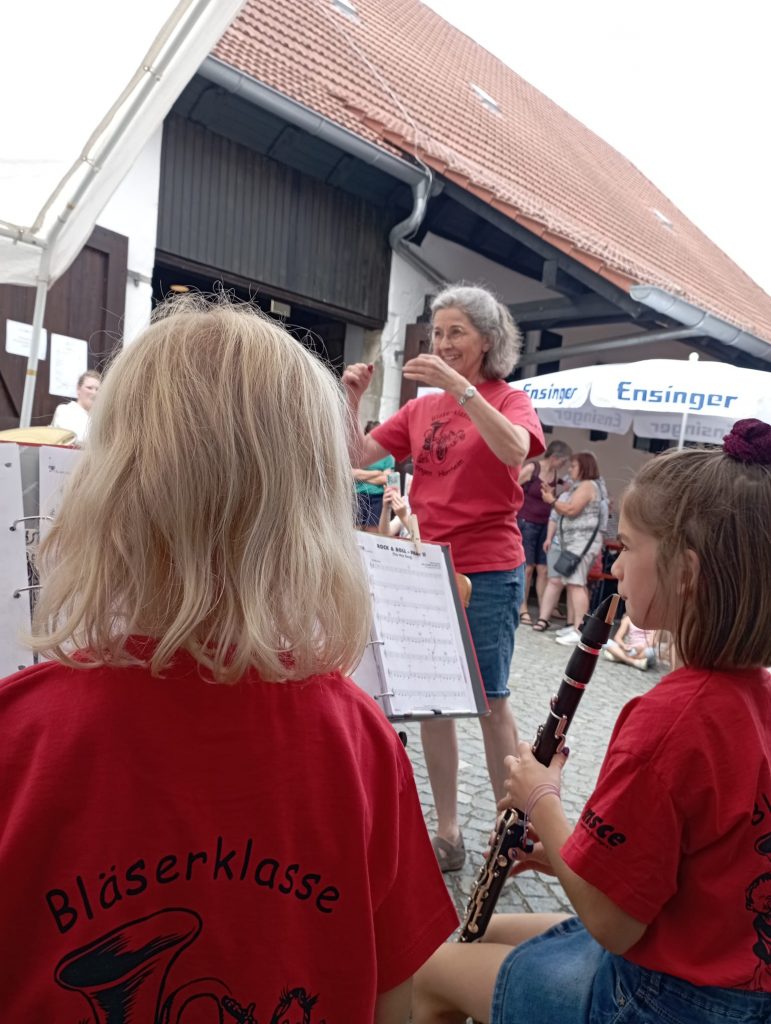 Im Anschluss erfolgte die Spendenübergabe aus dem Benefizkonzert der Egerländerbesetzung des Heeresmusikkorps Neubrandenburg, welches am 17. Mai in der Alten Kelter stattgefunden hatte. Die gesammelten Spenden in Höhe von 1.000 € kommen dem Förderverein der Bläserklasse Ensingen/Horrheim zu Gute, welcher die Bläserklasse damit unterstützen wird.