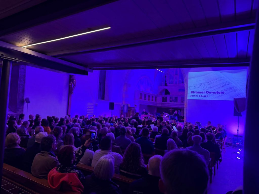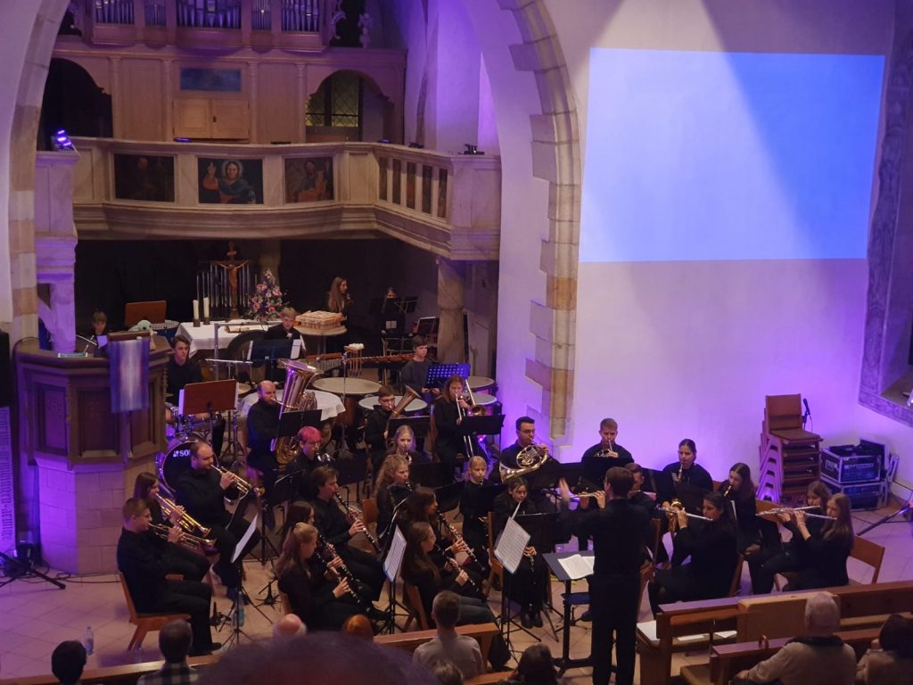 Ein besonderes Highlight des Abends war das Stück „Visions“, bei dem eindrucksvolle Lichteffekte den Kirchenraum in eine ganz besondere Stimmung tauchten. Auch das Publikum wurde immer wieder in das musikalische Geschehen eingebunden: So bewegten sich einige unserer Musikerinnen und Musiker durch die Kirche und musizierten mitten im Publikum. Eindrucksvolle Soli am Schlagzeug, an der Trompete, Flöte, am Tenorhorn und an der Tuba sorgten dabei für besondere Gänsehautmomente.
